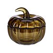 Lit wax candle inside a smoky glass container with a matching lid, near cinnamon sticks and a bowl of physalis, all with a soft blurred background suggesting an intimate atmosphere.