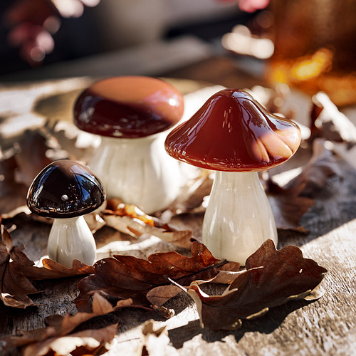 Create a nice indoor autumn vibe with these decorative ceramic mushrooms in warm colors. They come in various shapes and tones and are lovely on their own, yet make a stronger impression grouped together.