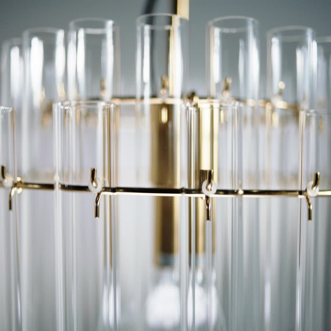 This elegant chandelier is guaranteed to be an eye-catcher with its 36 glass tubes hanging on brass-plated metal hooks.