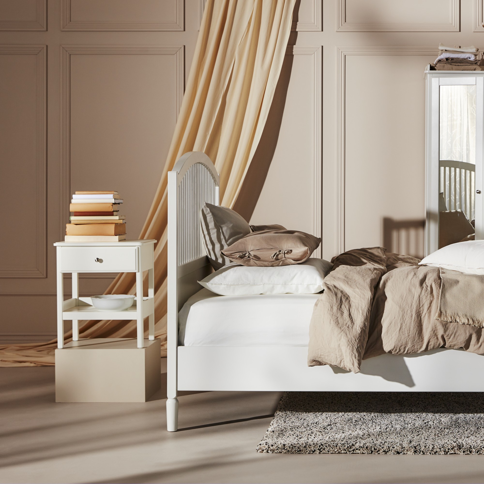 Light, neat and soft – with a handcrafted feeling in every detail. That’s a short description of the TYSSEDAL bedroom series. But there’s much more we’d like to tell you about. Like the fact that the sunlight can filter through the headboard, the wardrobe has mirrored doors and the chests and nightstand have softly shaped tops and drawer bottoms with a printed pattern. All the pieces are on turned legs and have handles in brushed chrome. TYSSEDAL is a complete bedroom series with quality and style that will last for many years.