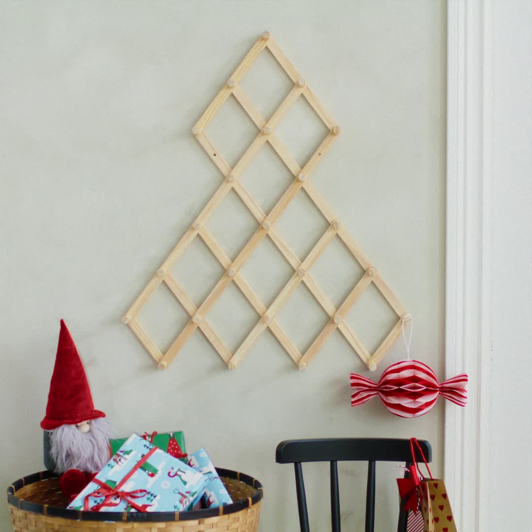 An alternative Christmas tree in pine for those with limited floor space. The flexible construction is easy to pull horizontally to the desired width and fill with decorations – and to fold up and store.