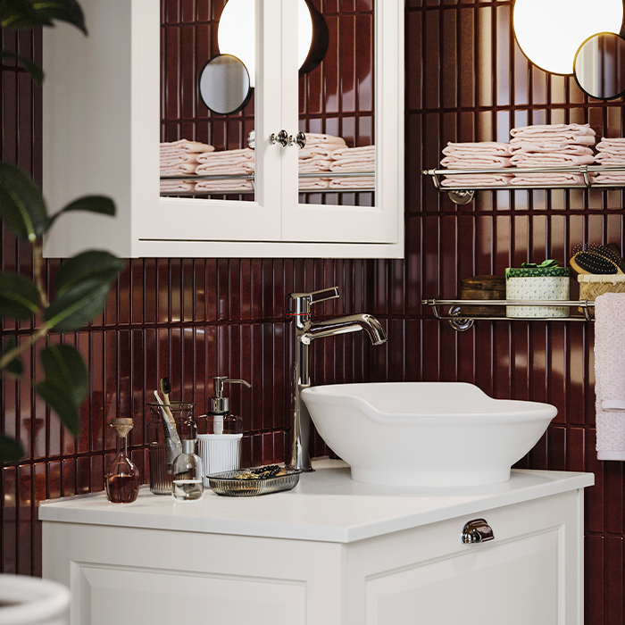 The BROFJÄRDEN brings a classical charm to your bathroom with artisanal items, like a lasting bathroom set of 3 pieces, a versatile towel hanger and a refined wall shelf. The chrome details bring sophistication, while the practical items, like the toilet brush and the soap dish, give a functional and elegant touch.