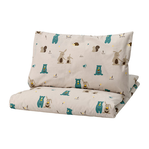 LEN duvet cover 1 pillowcase f crib, beige / bunny and bear pattern