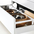 To stay organized and for efficient use of space, MAXIMERA drawers may be completed with VARIERA organizers like the cutlery tray, utensil tray or plate holder.