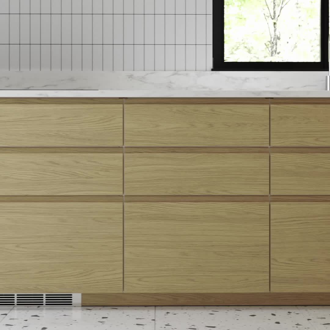 METOD kitchen system gives you endless possibilities to design your dream kitchen. Paired with VOXTORP fronts with oak expression and integrated handles you get a minimalist look with a warm feel.