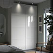 Dormitorio moderno con armario blanco PAX, puertas de vidrio e iluminación ambiental.