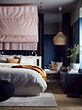 Dormitorio moderno con cama SONGESAND, dosel rosa claro, paredes azul oscuro, colgante tejido ligero y textiles acogedores.