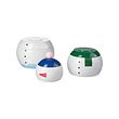Tres coloridos recipientes esféricos con perillas en la parte superior, cada uno en blanco, verde y azul con divertidos marcadores faciales.