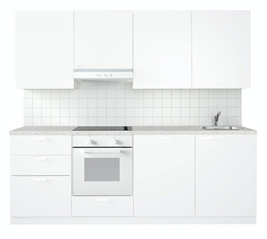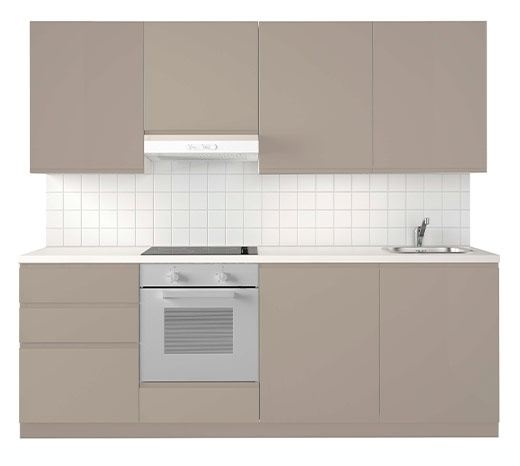 Cocina tipo 240x60, alto 228cm. El precio de la cocina tipo incluye: Los armarios, las puertas, los frontales, als encimeras, el grifo, el fregadero, los herrajes, los paneles de cubierta, las tiras y las molduras, las patas, los zócalos, los pomos/tiradores, y la iluminación. Los electrodomésticos y los accesorios de interior y de pared se venden por separado.