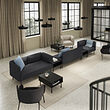 Salón moderno con sofá modular LILLEHEM en color gris, mesas de centro negras, lámparas colgantes negras y grandes ventanales con cortinas beige.