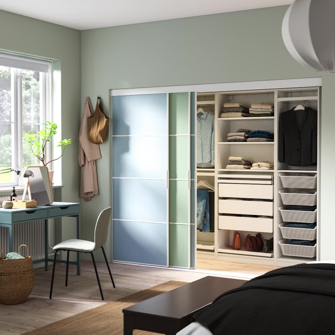 SKYTTA / PAX walk-in wardrobe with sliding doors, white double sided / Mehamn light blue / light green, 251x115x205 cm