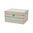 Un colchón de suelo plegable SLÄKT beige con ribetes verdes en una pila plegada. Es rectangular y está pensada para los niños.