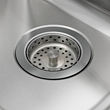 Desagüe de fregadero de acero inoxidable con colador, acabado pulido, tapón central, aspecto de calidad, bordes lisos.