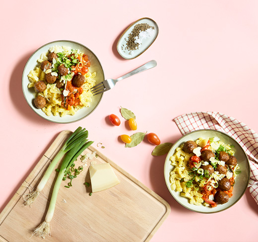 Albóndigas vegetales con pasta y sabroso ragú de tomate y espinacas