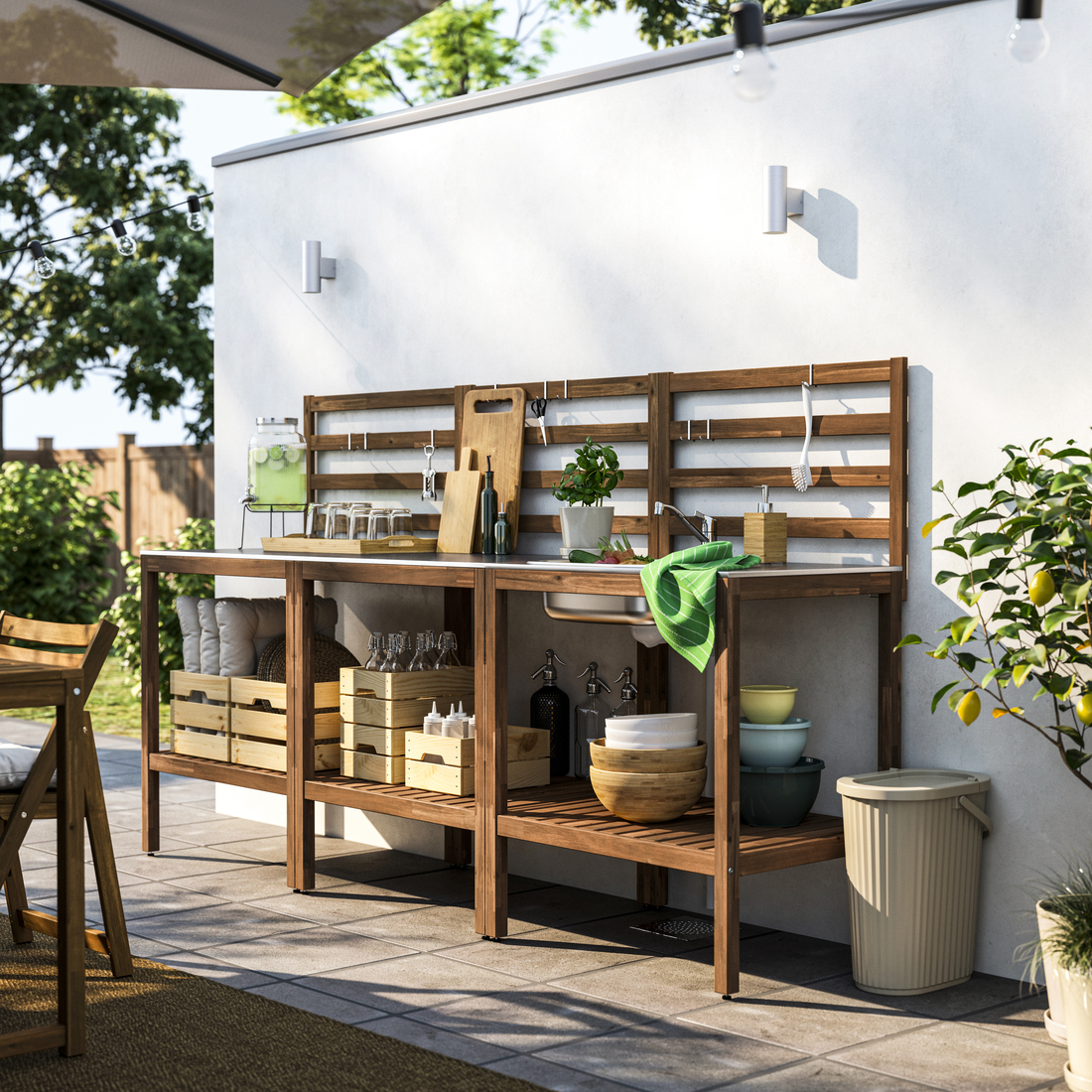 Nuestros módulos de cocina de exterior NÄMMARÖ incluyen un panel trasero de madera de acacia y tres ganchos ajustables para tener cerca los utensilios de cocina de exterior, los guantes para horno y los botes de especias. Además, el módulo de cocina NÄMMARÖ también sirve como banco para macetas, solo tienes que utilizar los ganchos para las herramientas de jardín. La madera se ha tratado previamente para una mayor protección contra el sol, la lluvia y las manchas.