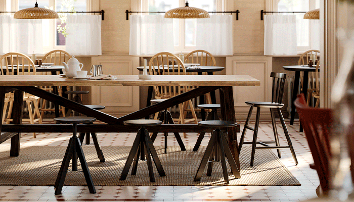 Juego de comedor SKOGSTA de 6 asientos con mesa de acacia y sillas con respaldo de huso, cerca de la ventana con lámparas y plantas.