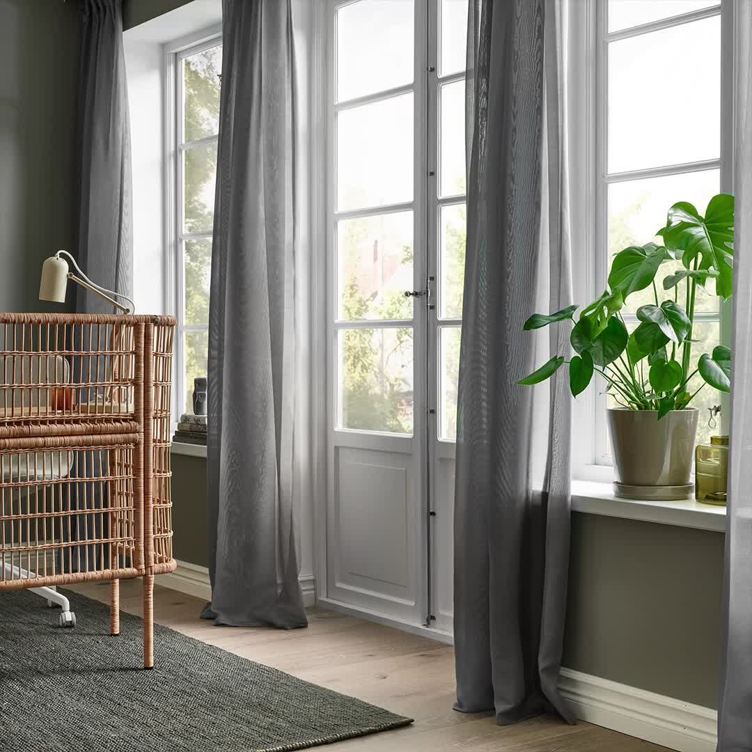 Los visillos STENFRÖ atenúan la luz del sol y realzan la ventana. El tono gris combina bien con otros tonos neutros y crea un aspecto elegante.