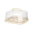 Portatarros de plástico transparente con tapa y portamagdalenas extraíble, con pestillos seguros y un asa para facilitar el transporte.