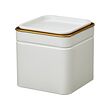 Una lata rectangular blanca BLOMNING con ribetes dorados. Es simple y elegante, perfecto para el almacenamiento.