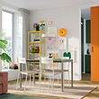 Moderna silla blanca BUSLÄTT colocada alrededor de una pequeña mesa de comedor con mueble de madera al fondo.