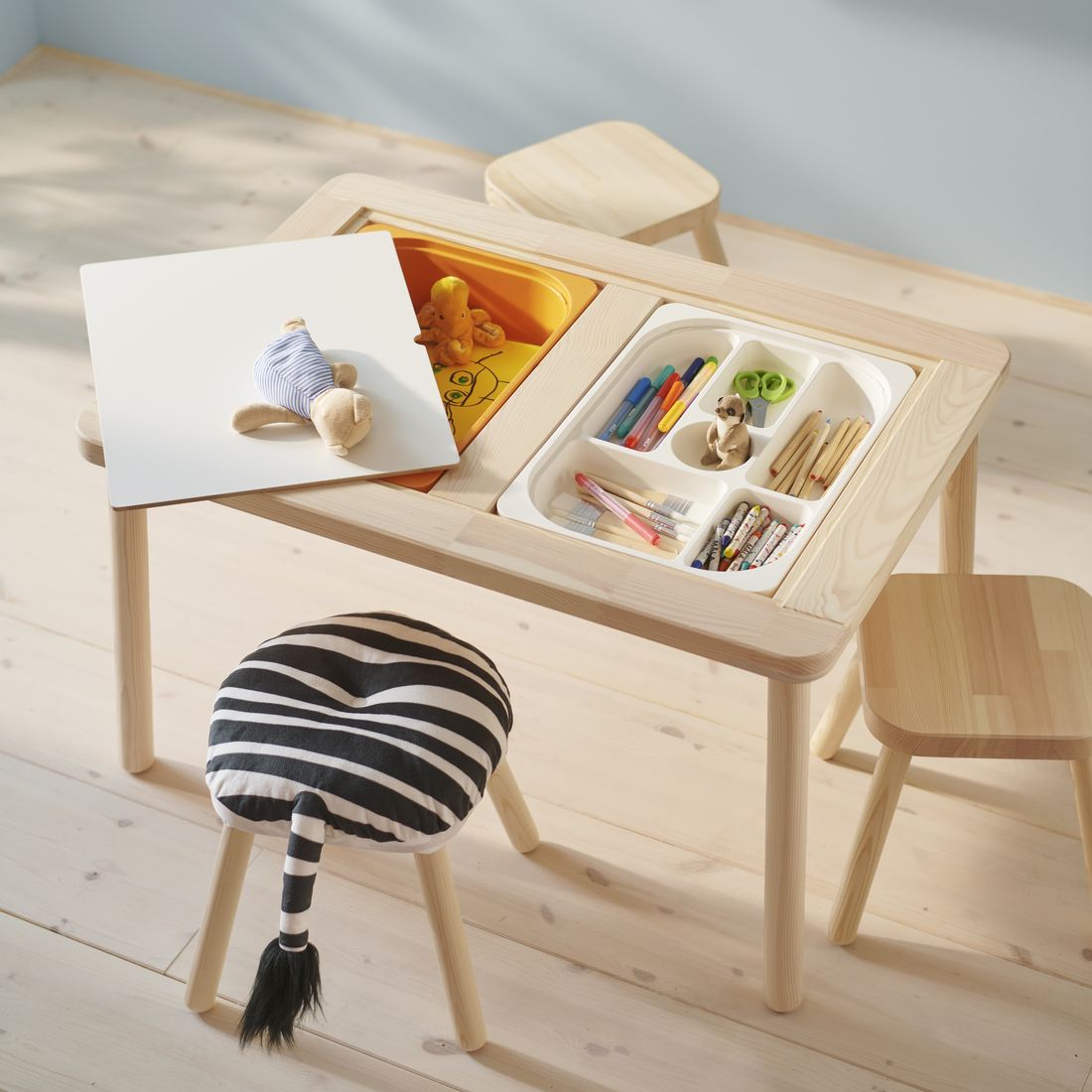 The top of FLISAT children’s table consists of two lids that fit TROFAST storage boxes. Your child can keep toys at hand at all times – and clean up in a jiff!