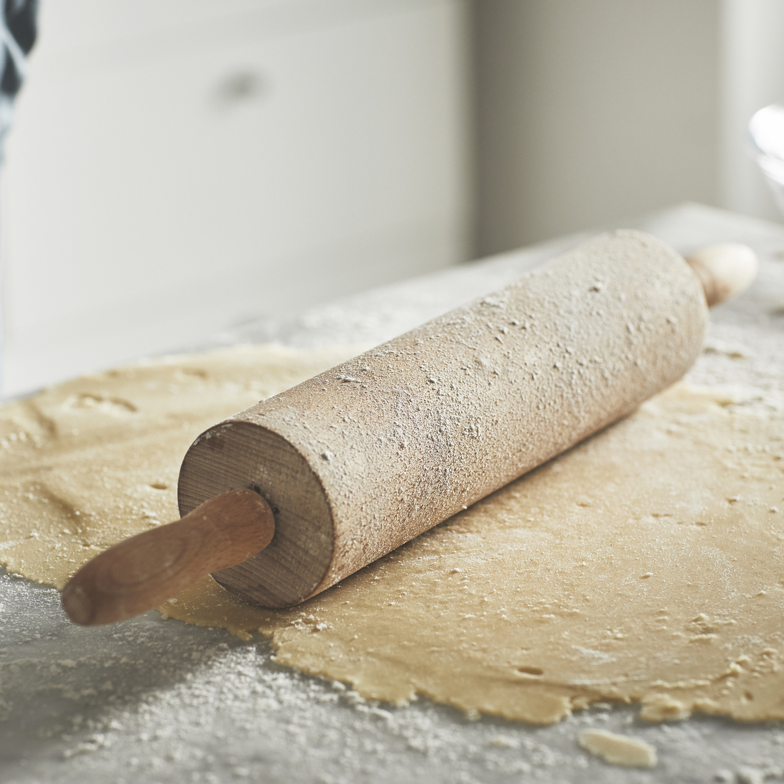 Rodillo. Nombre: MAGASIN. Madera de color marrón claro. Cilíndrico con asas curvas. Herramienta clásica para hornear.