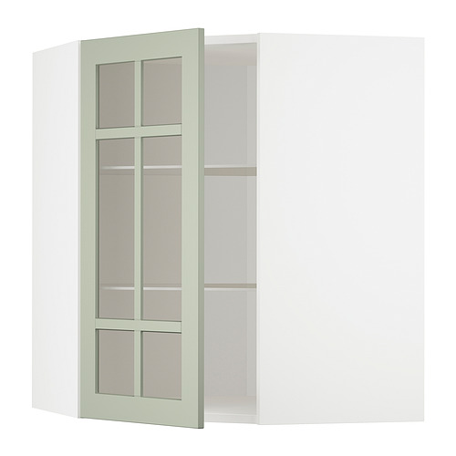 METOD corner wall cab w shelves / glass dr, white / Stensund light green