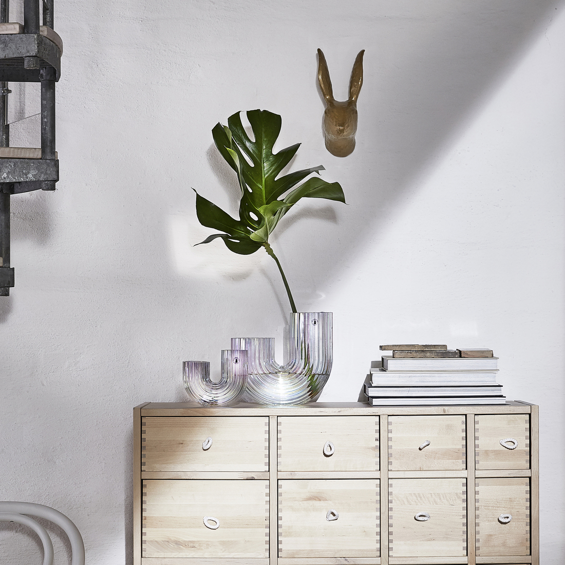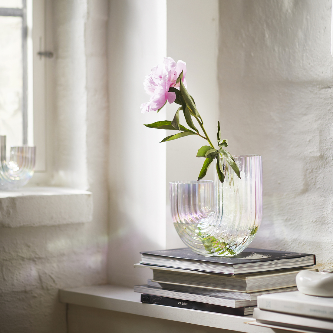 RÄFFELBJÖRK vase, designed by Lisa Hilland, is inspired by rainbows and has a flowingly playful shape and a shimmering finish. Put your favorite flowers in it – or enjoy it as beautiful glass sculpture.