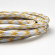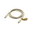 Dos cables usb-c beige con tela tejida azul/amarilla sobre superficie blanca, conectores de la marca.