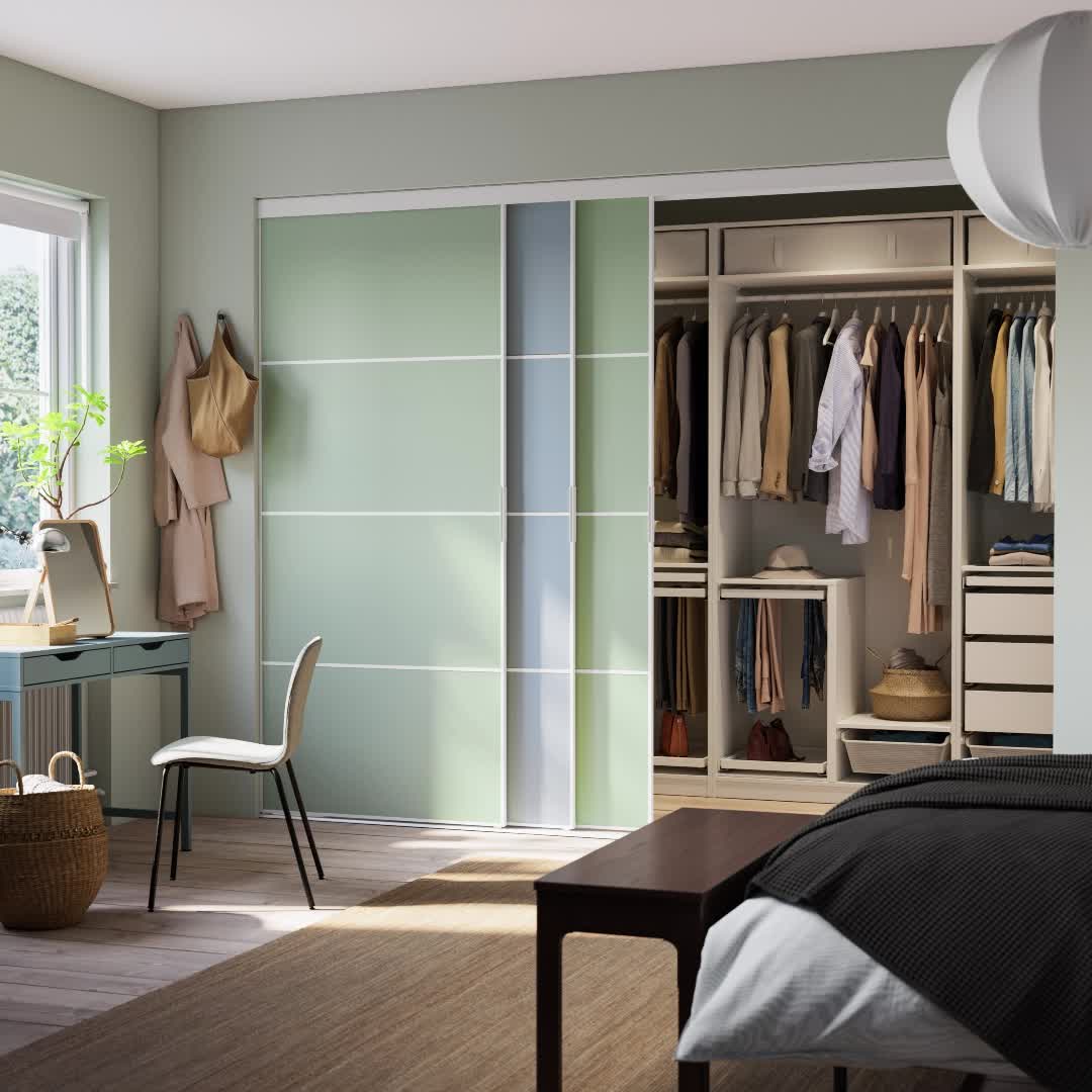 SKYTTA / PAX walk-in wardrobe with sliding doors, white double sided / Mehamn light blue / light green, 301x160x240 cm