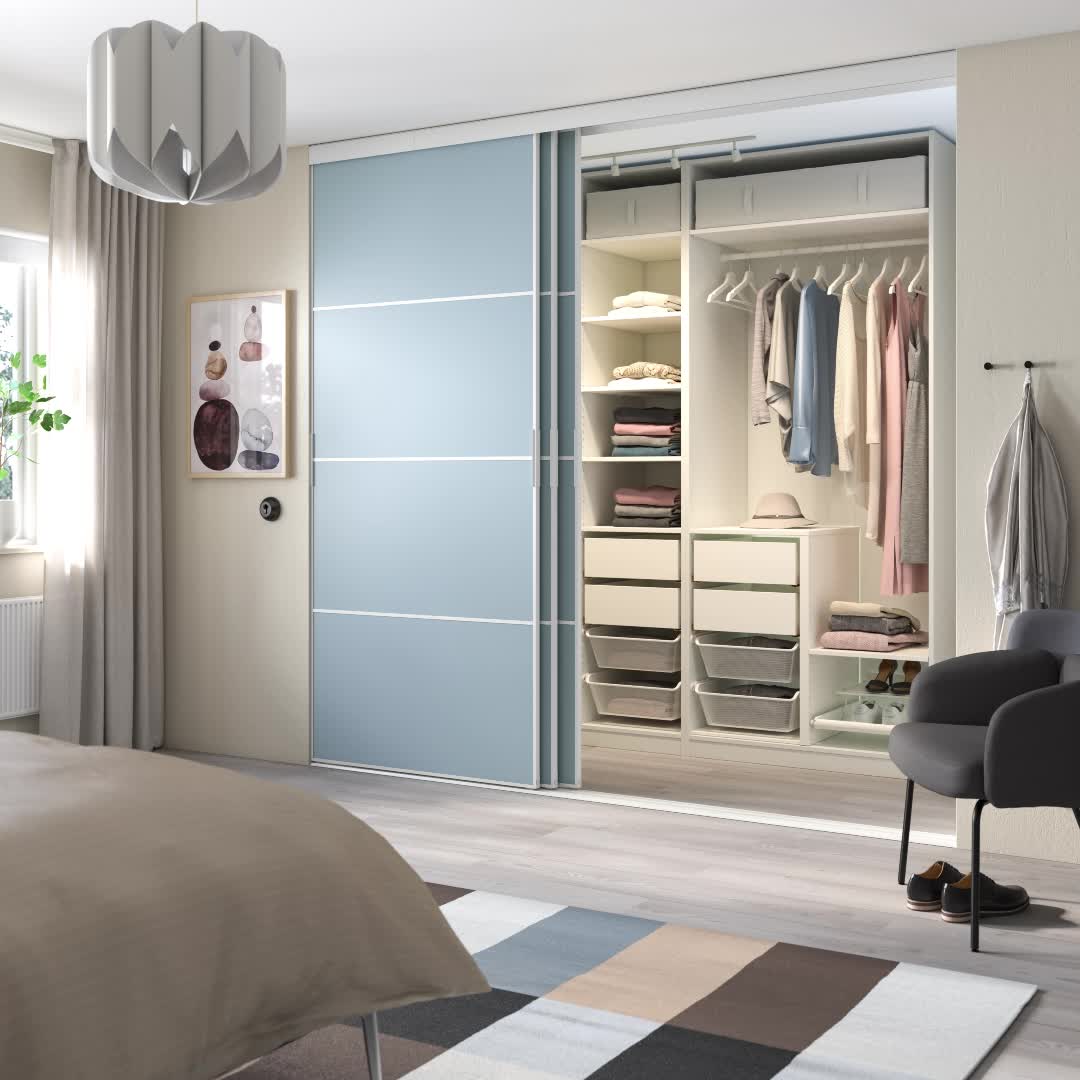 El video muestra una escena de dormitorio con un gran armario con el producto llamado SKYTTA/pax ss1 w-i wh ds/meh lblue nn. Este armario tiene una combinación de puertas blancas y tiradores azul oscuro, con estantes en el interior para el almacenamiento. El diseño general es moderno y elegante, y combina bien con la decoración de las habitaciones. El video captura varios ángulos del armario en diferentes escenarios dentro del entorno del dormitorio.