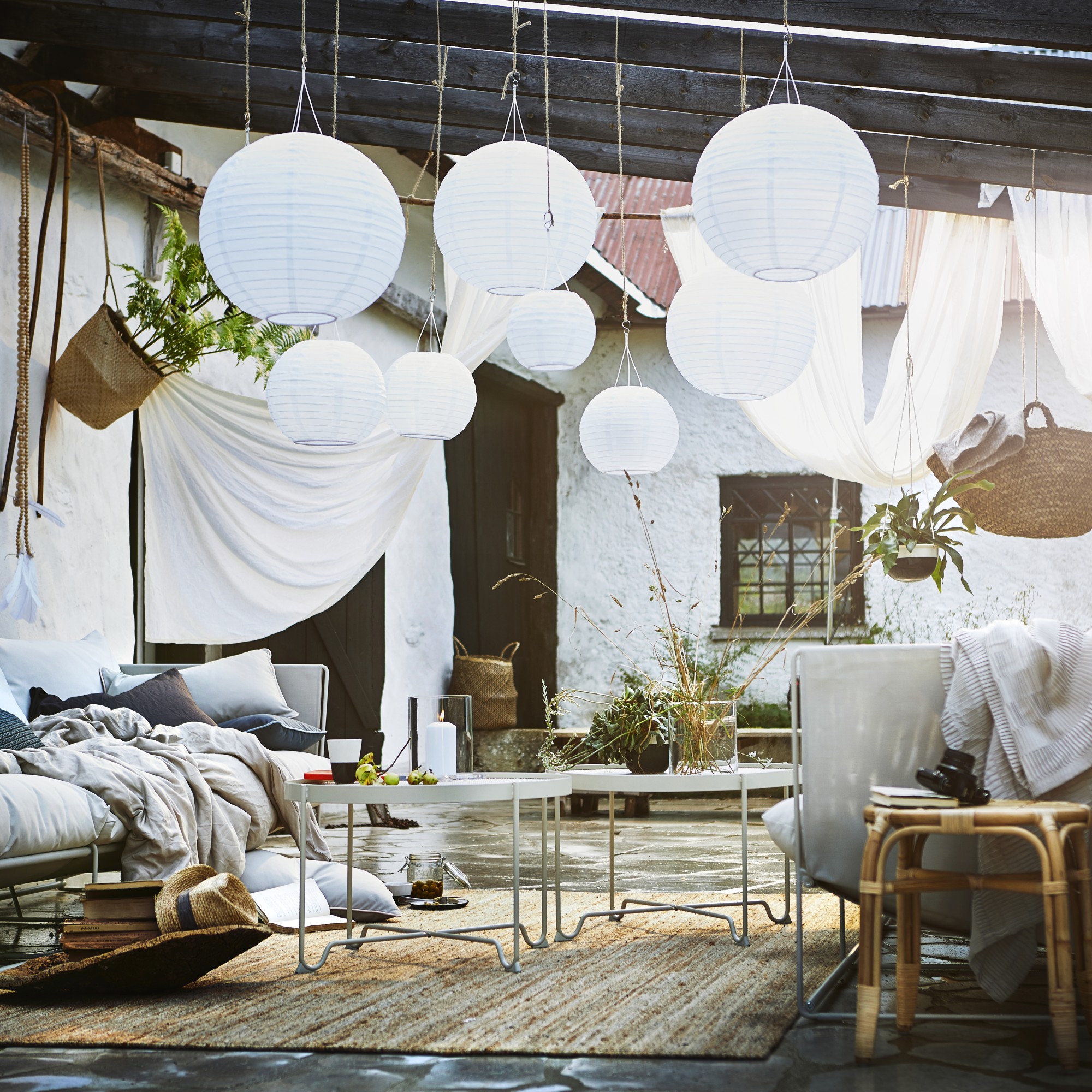 Use SOLVINDEN pendant lamps to fill your outdoor space with light and cosiness in a flash. Mix colors, patterns and sizes – they all have solar-powered LED bulbs and shades made of recycled PET bottles.