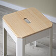 Taburete individual de madera con acabado claro, recorte redondo para el asa y patas de metal blanco. Diseño sencillo, robusto y funcional.