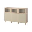 Aparador BESTÅ: tres secciones con puertas de vidrio en la parte superior, parte inferior beige, patas de roble.
