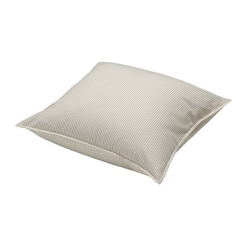 SOLFIBBLA, una almohada de algodón a rayas beige y blancas. Tiene forma cuadrada y un diseño sencillo de rayas.