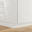 Zócalo de armario de cocina blanco brillante sobre suelo de madera.