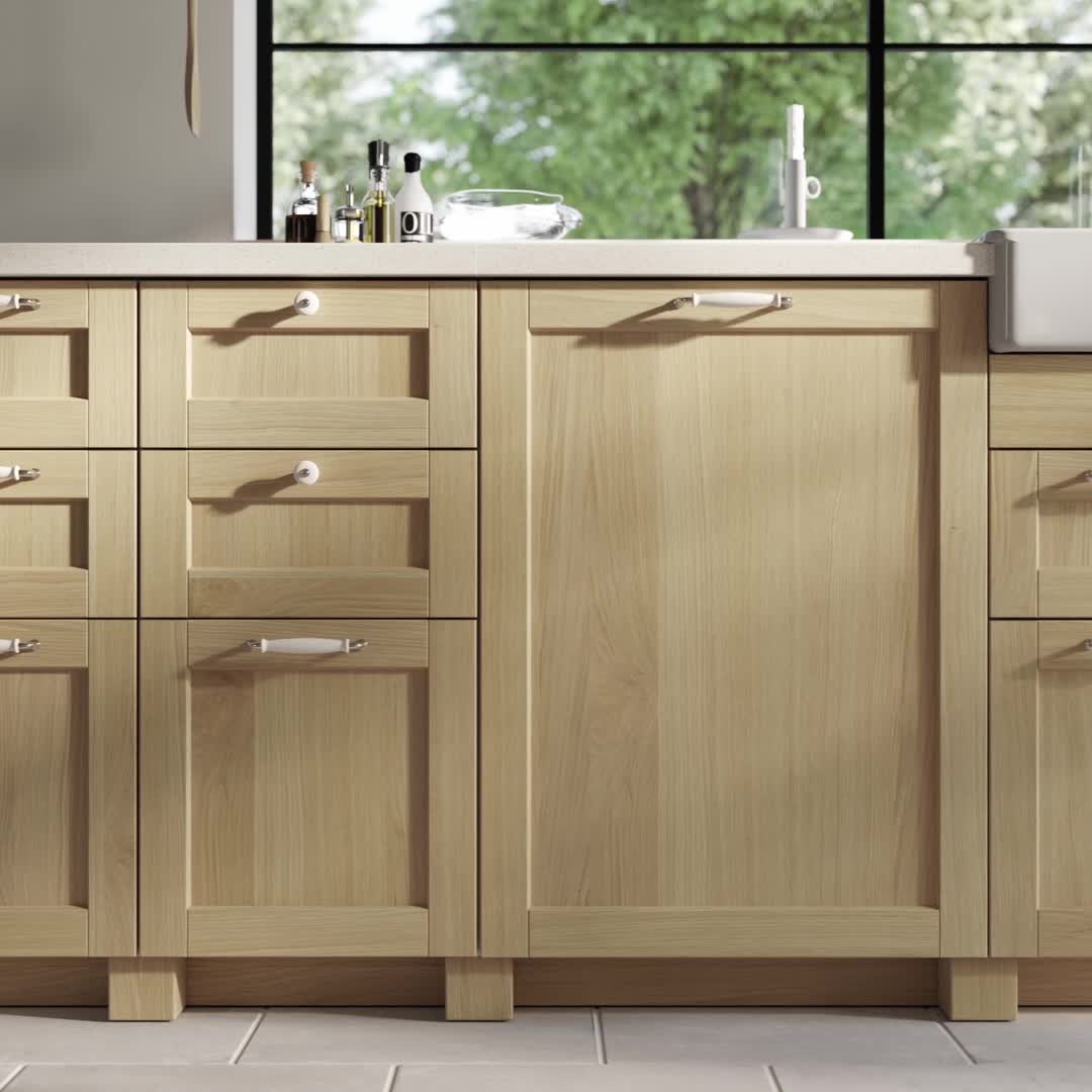 FORSBACKA kitchen fronts in warm oak veneer welcome you and make you feel right at home. The framed door with beveled edges creates a classic, traditional character.