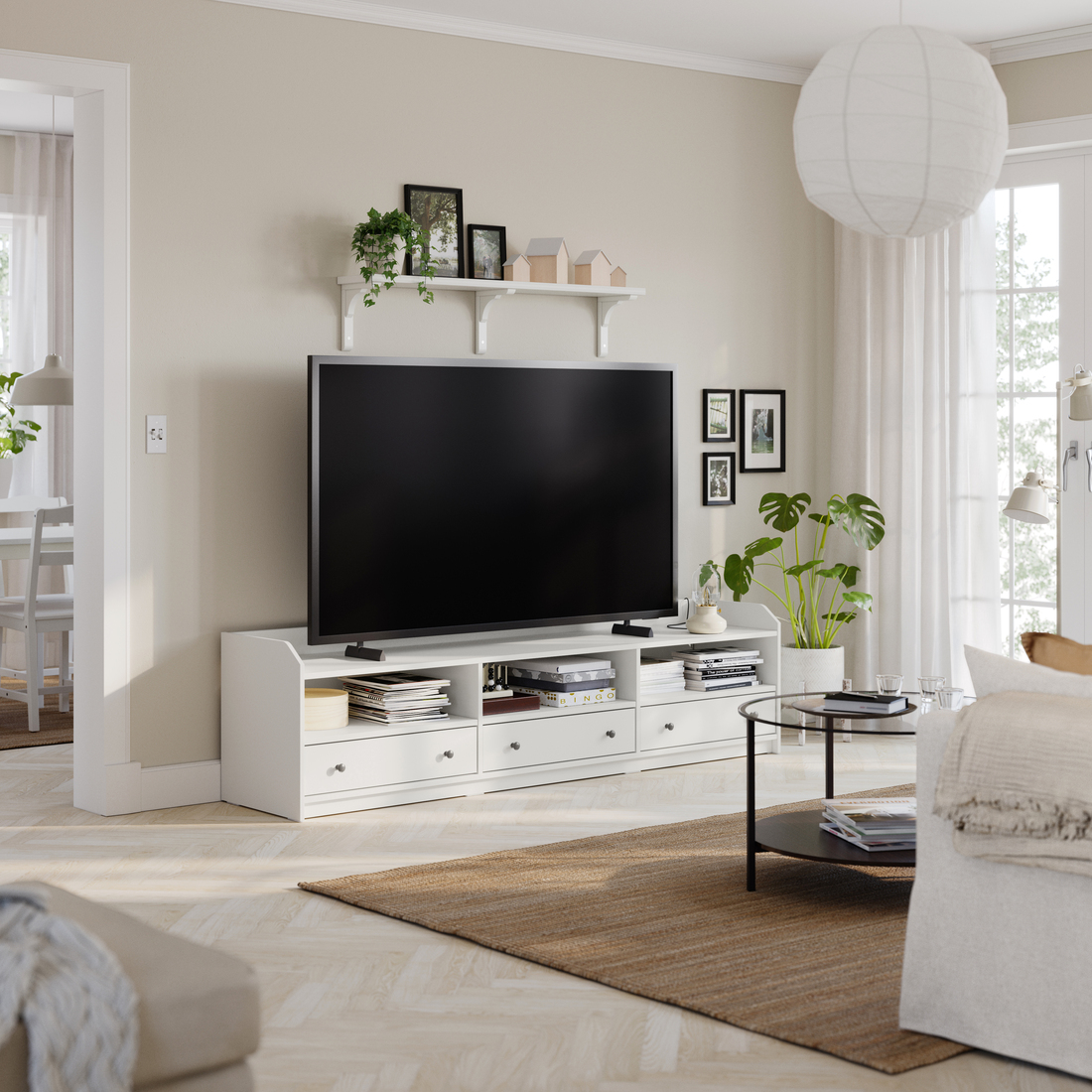 Use throughout the home, on its own or with other furniture in the HAUGA series. This extra-wide TV bench has 3 drawers where you can store accessories – and cable management to keep all cables tidy.