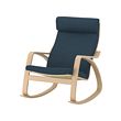 Mecedora POÄNG, madera clara, cojines, respaldos y asiento azul oscuro, forma curvada, respaldo alto, diseño cómodo y ergonómico.