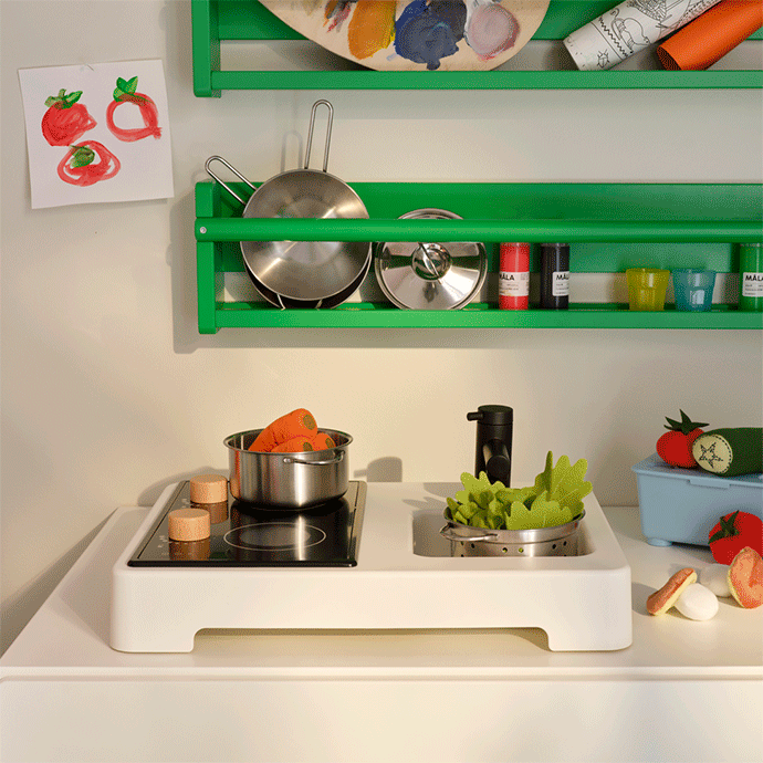 And when you though this living room couldn't be more complete... you discover this adorable á la carte restaurant in a corner! A space where grownups can relax while the little ones at home have fun and prepare a delicious dinner for their favorite soft toys.