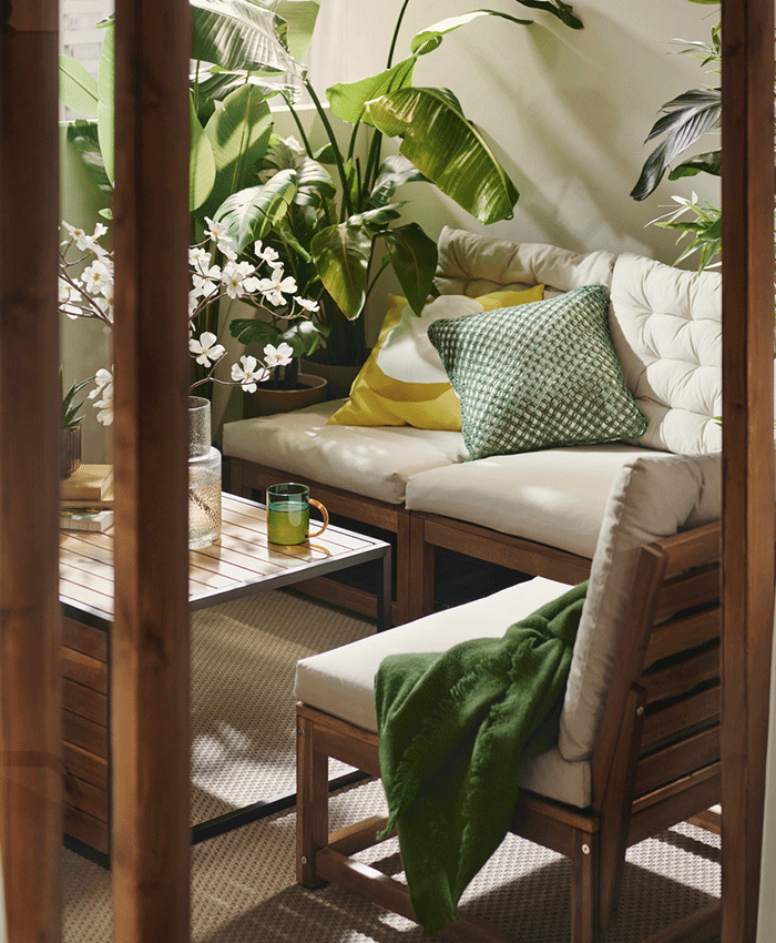 Longing for a space to unwind? Create your own balcony oasis with NÄMMARÖ easy chair, a privacy screen and matching furniture for lounging, storage and hobby projects. Green it up with a mix of real plants and artificial forever-fresh flower spray.