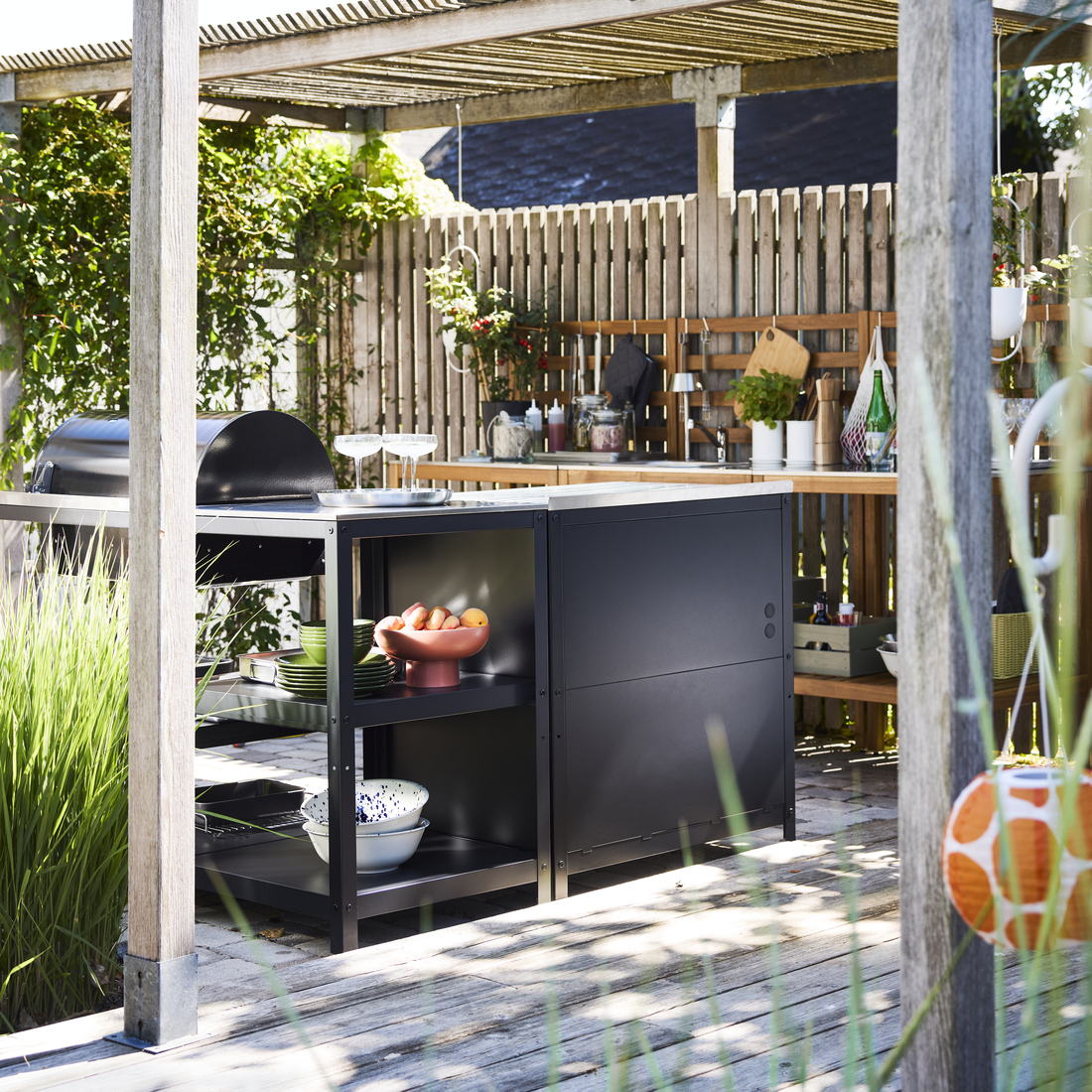 Si quieres tener una cocina completa al aire libre, puedes completar la solución con la parrilla de carbón y el módulo de fregadero GRILLSKÄR, que se venden por separado.