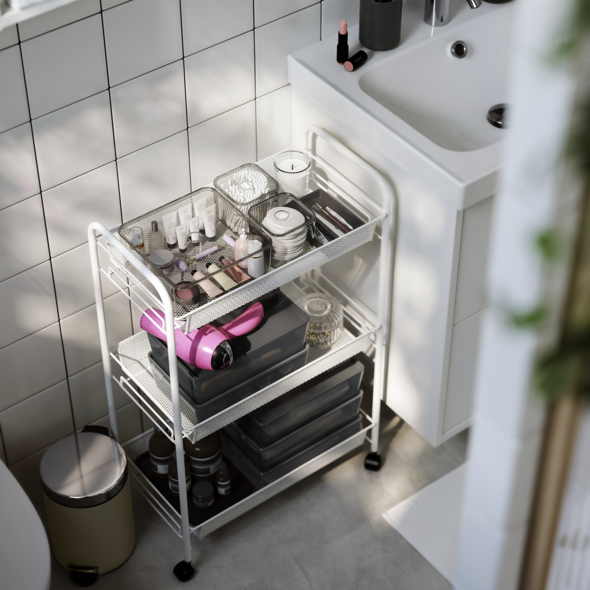 Carro de almacenamiento metálico blanco de 3 niveles, rodante sobre ruedas negras, diseño elegante y moderno, ideal para la organización del baño.