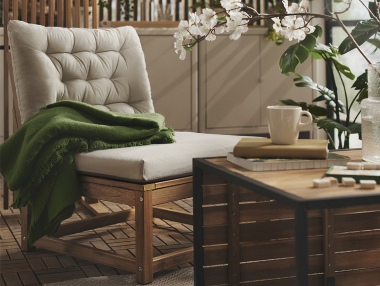 ¿Necesitas espacio para relajarte? Crea tu propio balcón-oasis con el sillón NÄMMARÖ, una pantalla de privacidad y muebles a juego para desconectar, almacenar y realizar tus proyectos. Dale un toque de verde con una mezcla de plantas reales y una oleada de flores artificiales que siempre estarán frescas.