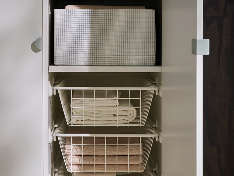Dream of a minimal Japandi-style room with a decluttered closet? The key is to create room for your things so they don’t spill out into the rest of the room. Keep only clothes and objects you love and give everything its own space. Here, calm tones and ordered storage send Zen-like vibes through the whole bedroom.