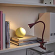 Una lámpara de abrazadera NÄVLINGE de color burdeos en un estante, iluminando una esfera amarilla sobre libros. Delgado y ajustable, contrasta con libros y cajas más grandes.