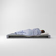 Una persona duerme en un colchón azul, diseño de borde gris y blanco; muelles firmes, base gris.