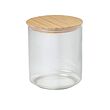 Tarro de vidrio transparente con tapa de bambú, forma cilíndrica.