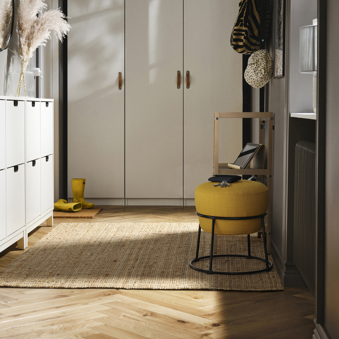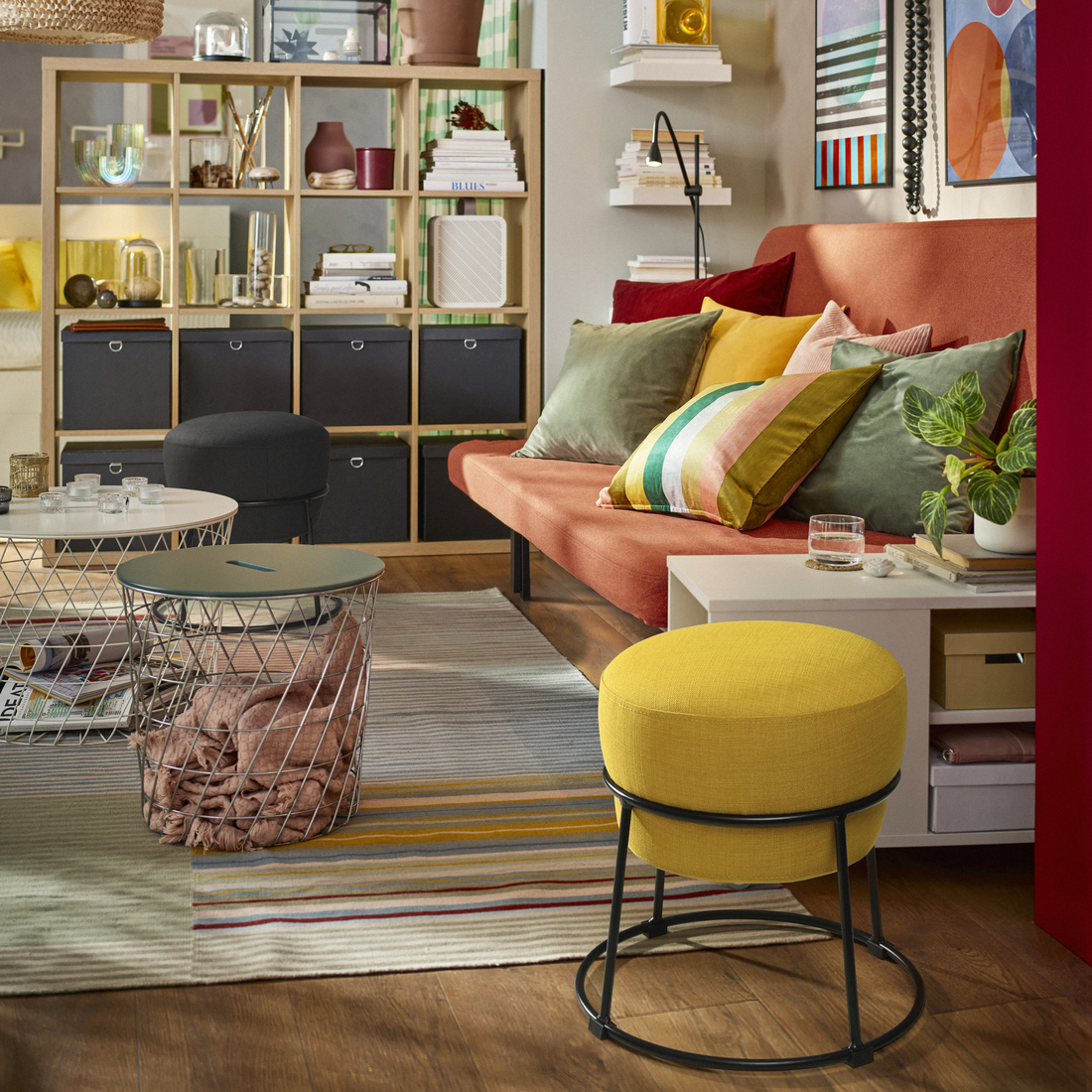 La forma del puf EMMISLÖV parece un tapón de una botella de champán. La sencilla estructura de metal y el asiento de tela que parece flotar en el aire crean una expresión gráfica que queda genial en un hogar moderno.