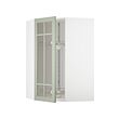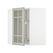 Un gabinete de cocina con puerta de vidrio verde claro del sistema METOD de ikea, con un diseño elegante con estantes ajustables.